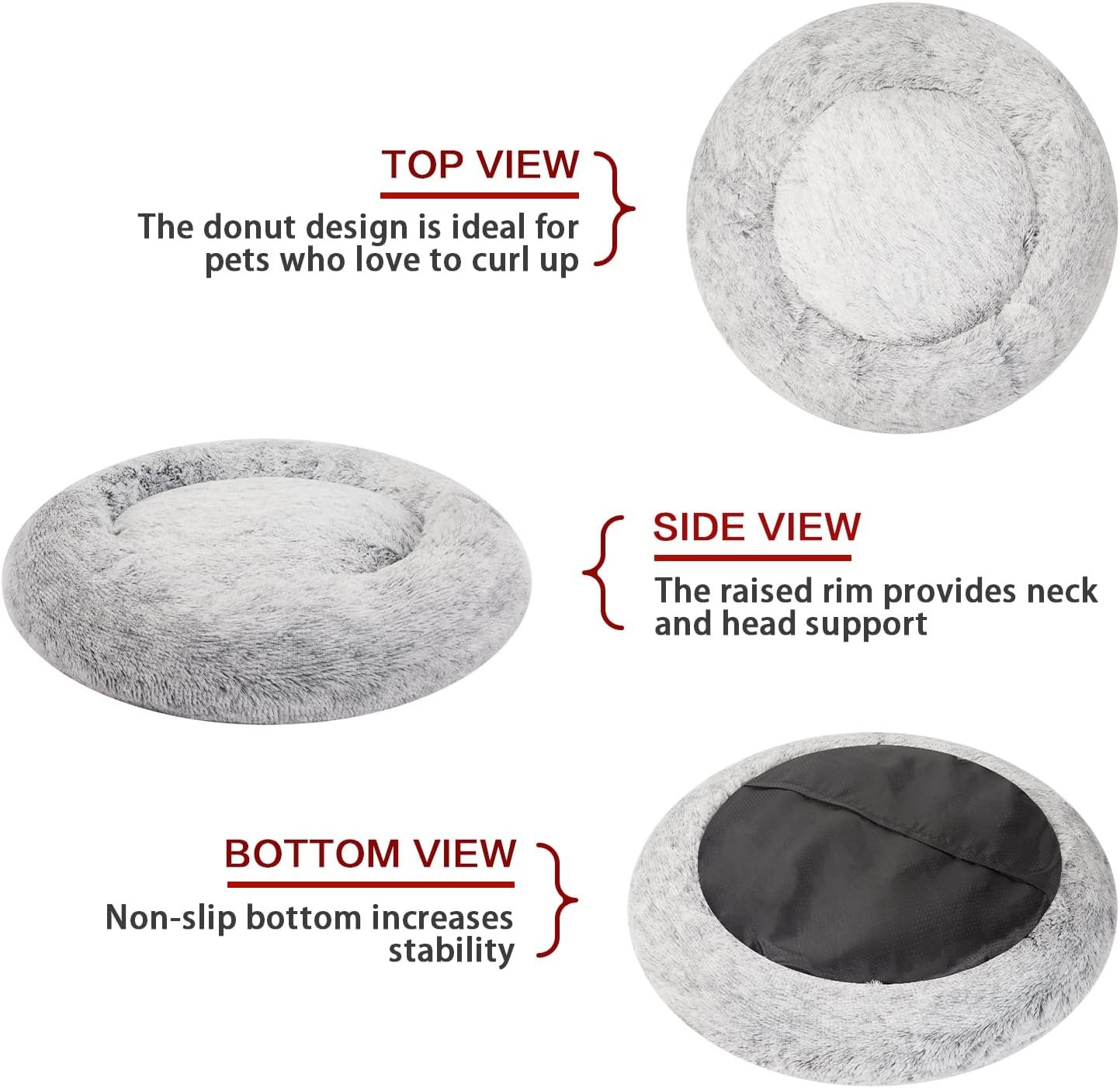 Create a cozy nest that can help ease anxiety with a donut‑shape bolstered rim for head‑and‑neck support and ultra‑soft faux‑fur that mimics a mother’s coat for deeper, more secure rest. A removable, machine‑washable design and water‑/dirt‑resistant or anti‑slip bottom simplify upkeep and keep the bed in place on hard floors; multiple diameters suit small to extra‑large pets and blend with modern décor.
