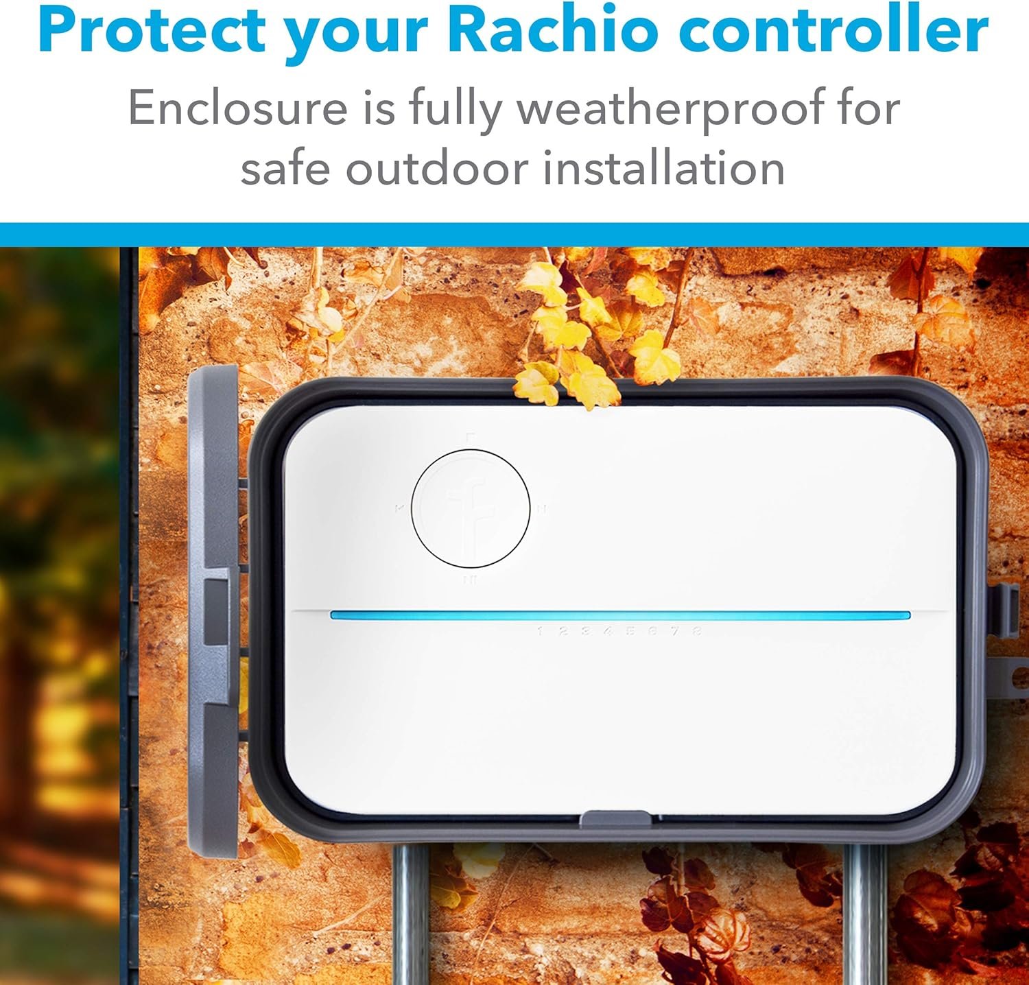 Protects a Rachio smart sprinkler controller from rain, dust, and sun when mounted outside; supports clean cable management with left‑side AC power entry and right‑side zone wiring, plus room for strain‑relief fittings. Installs in about 30 minutes with included anchors, bolts, and connector caps; IP54‑rated enclosure can be hardwired by an electrician or powered via pigtail to a GFCI outlet, then locked to deter tampering.